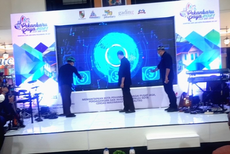 PEKANBARU- Masih dalam rangka perayaan Hari Jadi Kota Pekanbaru yang ke-237, tahun 2021, Walikota Pekanbaru Firdaus didampingi oleh Asisten I Pemko Azwan dan didampingi Ketua Pelaksana Pekan Raya, Ingot Ahmad Hutasuhut, membuka secara digital peresmian Pekan Raya, Fair and Expo 2021, Kamis (24/6/2021), sore.
