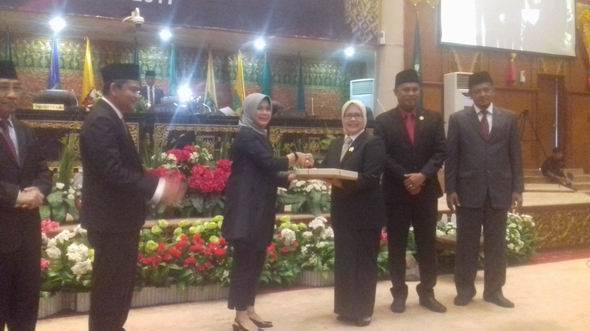 Ketua DPRD Riau, Hj Septina Primawati menerima LHP BPK tahun 2017 dari Tim V Auditor Ismayatun