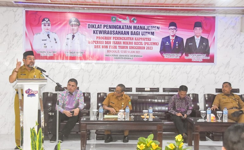 BENGKALIS - Guna meningkat pemahaman dan manajemen kewirausahaan bagi pelaku Usaha Mikro, Kecil dan Menengah, Pemerintah Kabupaten Bengkalis melalui Dinas Koperasi, Usaha Kecil dan Menengah (UKM) melakukan Pendidikan dan Pelatihan (Diklat), di Aula Pertemuan Hotel Surya Bengkalis, Senin, 12 Juni 2023.