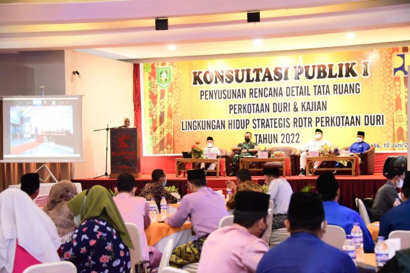 BATHIN SOLAPAN - Bupati Bengkalis Kasmarni membuka acara pembukaan konsultasi publik I penyusunan Rencana Detail Tata Ruang (RDTR) dan Kajian Lingkungan Hidup Strategis (KLHS) perkotaan Duri, Jum'at, 10 Juni 2022 di Hotel Surya Duri.